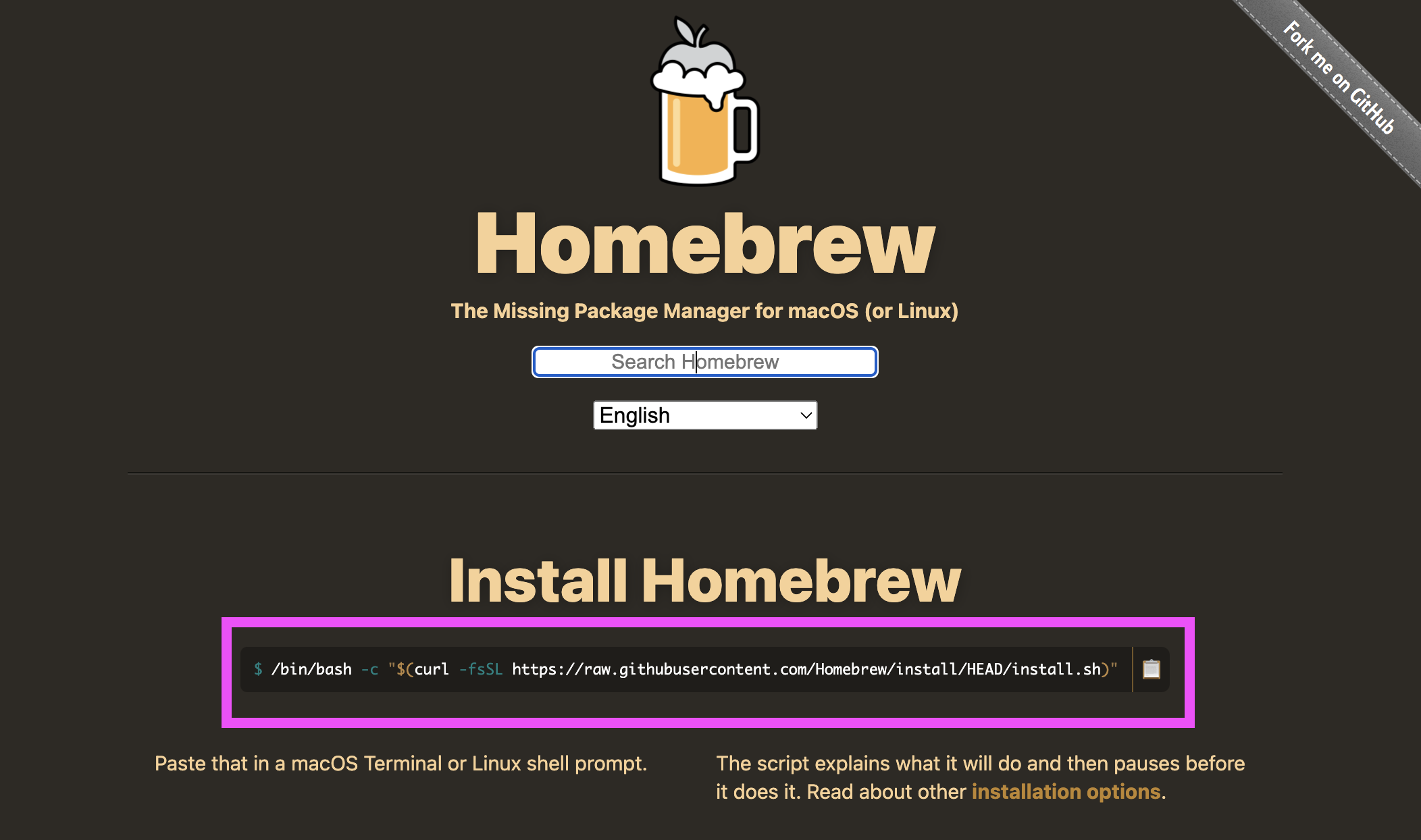 그리고 homebrew 사이트에서 링크를 따와서 홈브류까지 다운받아주면 이제 다양한 패키지를 다운받고 그 명령어를 실행할 준비가 완료된다.