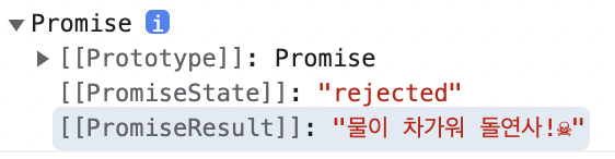 reject('물이 차가워 돌연사!☠️') //Uncaught (in promise) 물이 차가워 돌연사!☠️