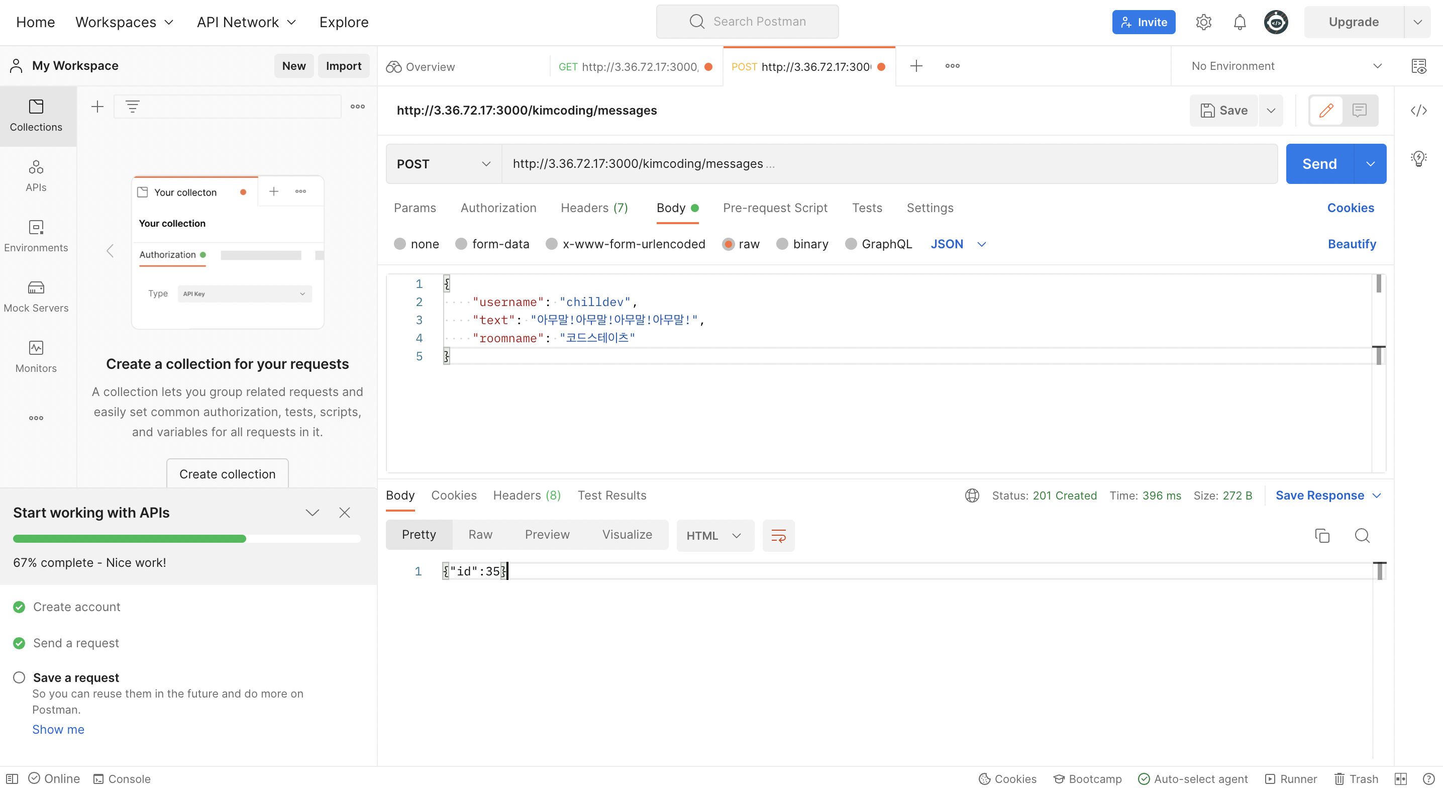 3. +탭 눌러 새로운 탭 만들고, 요청/응답을 여러 개 확인